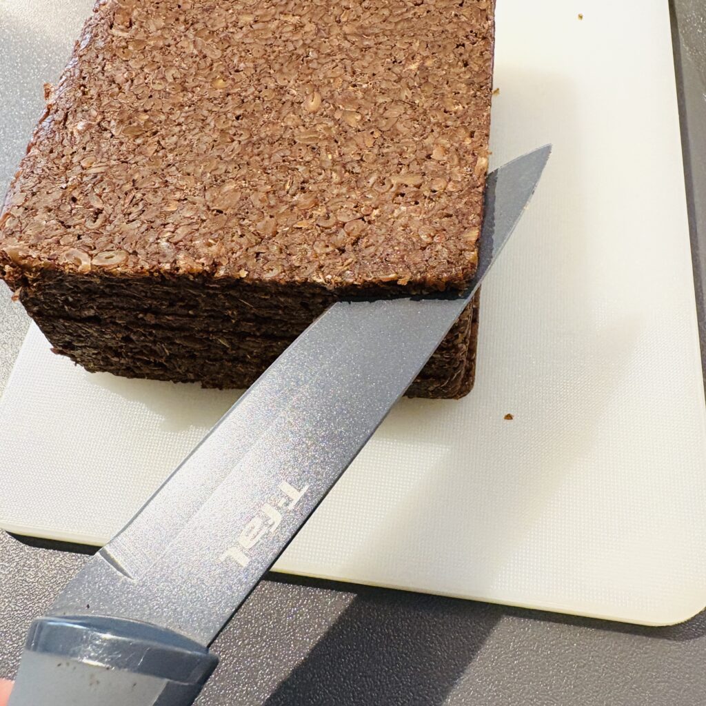 オーガニック プンパーニッケルは、重さ500グラムの9枚切りのライ麦パンです。